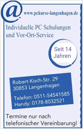 Herzlich willkommen bei PC Kurse Langenhagen,wir freuen uns, Sie auf unserer Seite begrüßen zu dürfen.Supportende Windows 10!Wir helfen Ihnen beim Upgrade auf Windows 11, auch bei inkompatiblen Geräten fast immer möglich!Rufen Sie uns an!Termine nach telefonischer Vereinbarung!Festnetz:0511-54541585mobil:0178 8032521Mo - Fr von 11:00 - 18:00 UhrIhr Team von PC Kurse Langenhagen